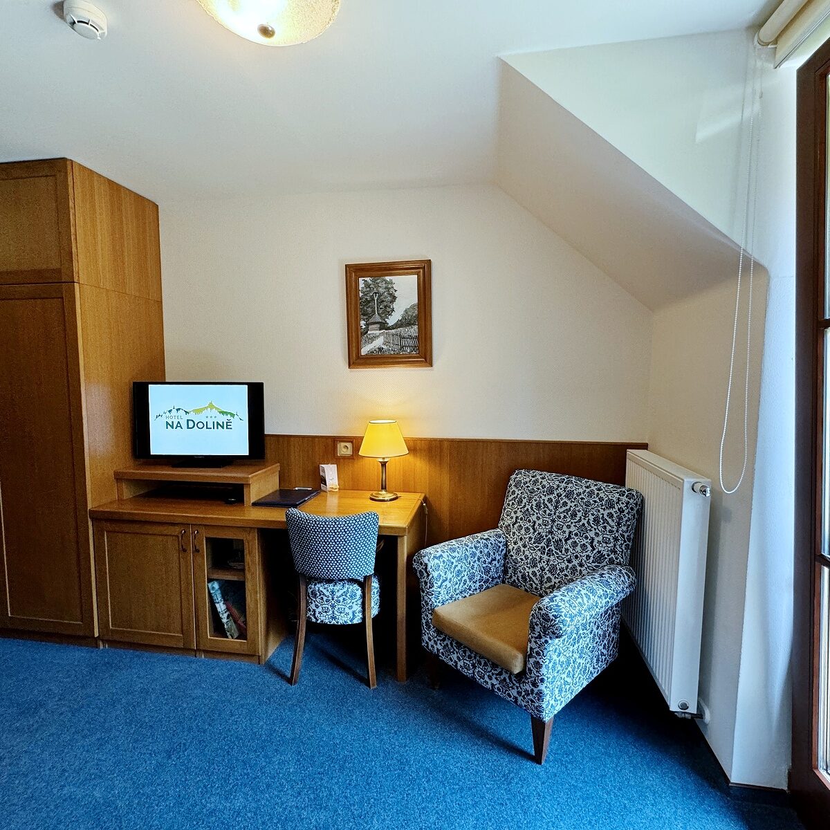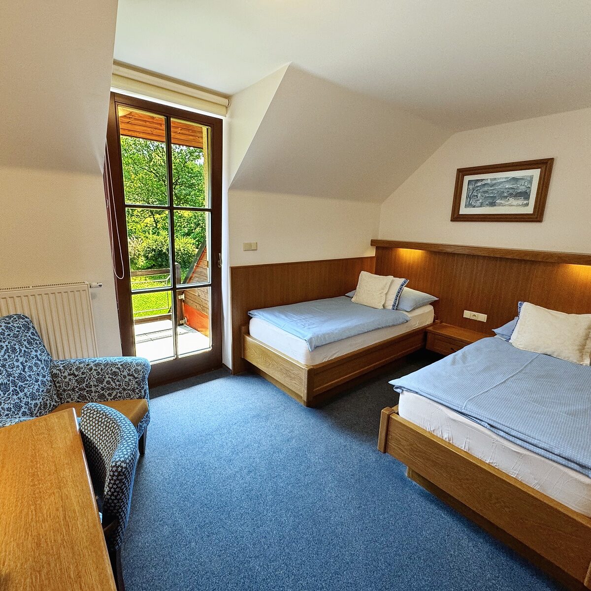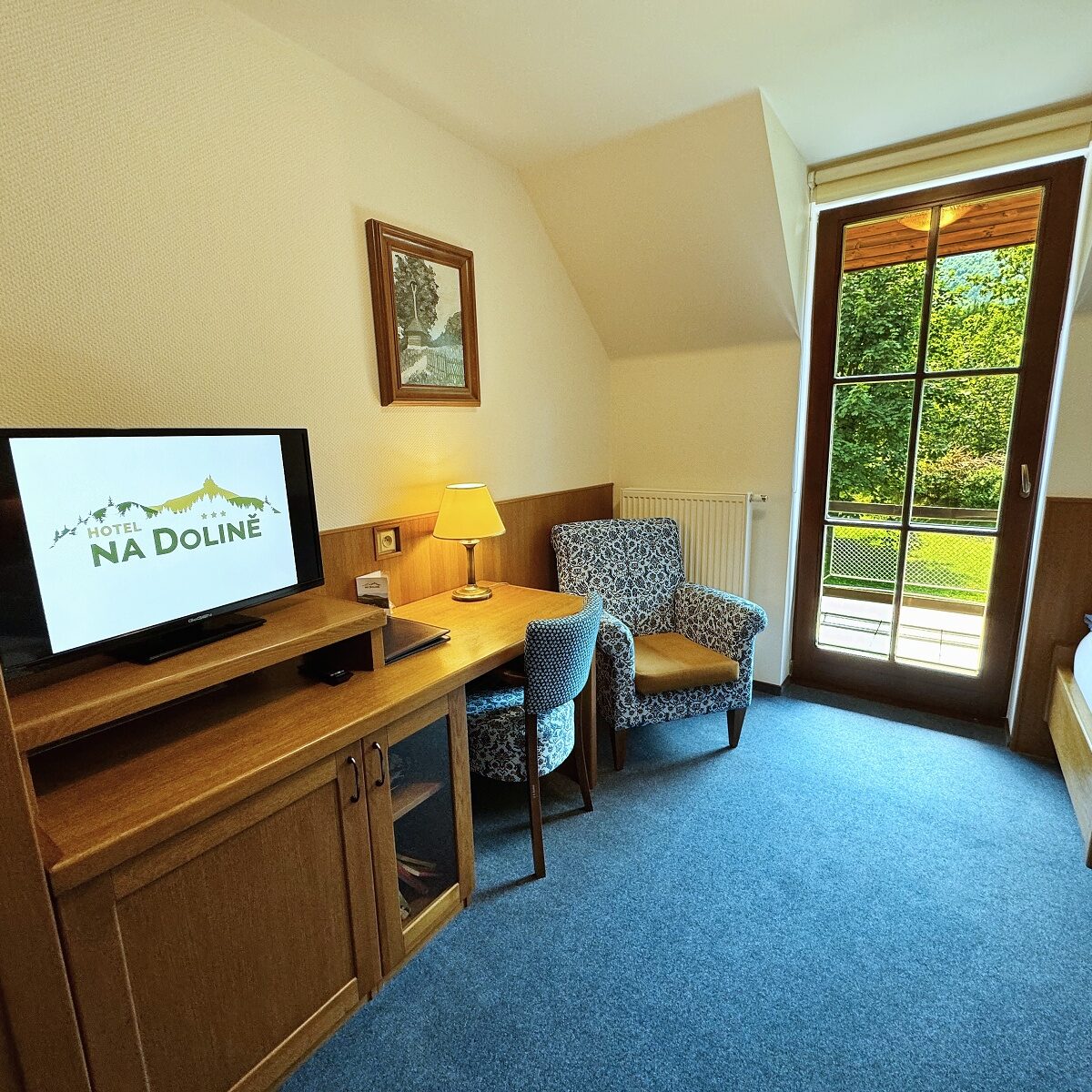 Comfort category room with two beds, ideal for business travellers or single guests. It is equipped with a desk, chair, wardrobe, storage space for suitcase, TV and minibar. The room has a private bathroom with toilet and shower accessible directly from the room. This room is located in the adjoining Andela building on the first floor. It has a small balcony overlooking the forest and the Radhost mountain.